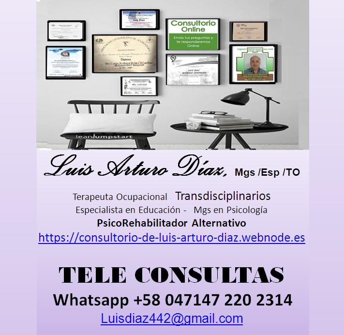 La firma profesional del Especialista Luis Díaz Consultor , se ofrece los servicio online de consulta por nuestro especialistas en el ramo de la Rehabilitación, terapia alternativa y psicoterapia, una consulta personalizada de Terapia Online, en sesiones terapéuticas on-line, para todos aquellos interesados que no se puedan desplazar hasta la consulta ( por la pandemia o por otras circunstancias). Entre las ventajas que ofrece Luis Díaz Consultor FP , están: